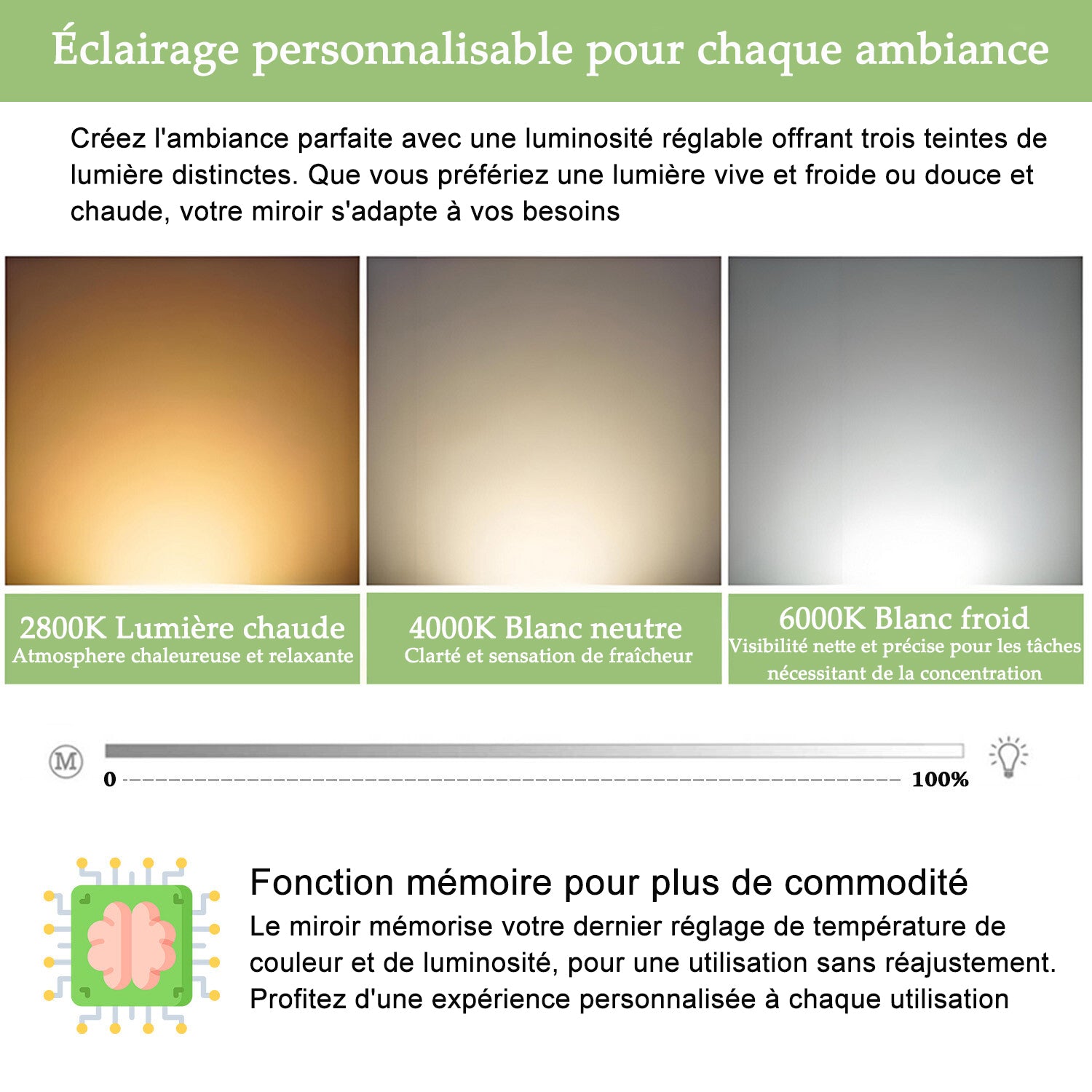 - Équipé d’un ruban LED de haute qualité placé sur le bord du miroir, il offre lumière réglable en température de couleur entre 2800K et 6000K, et en luminosité, selon vos envies.